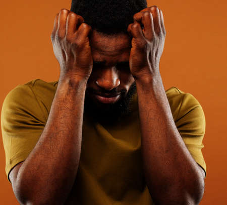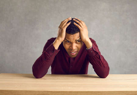 Desperate sad african american man holding head with hands looking stressed sitting at desk studio shot. Frustrated upset black guy having problem face portrait. Negative people emotion concept