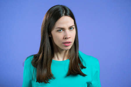 Furious woman on violet background. Lady in stress and rage, she threatens with aggression and looking at camera.