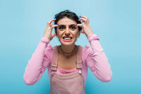 angry woman grimacing and gesturing while looking at camera isolated on blue