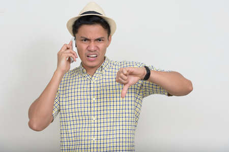 Portrait of stressed Asian tourist man talking on the phone
