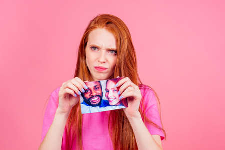 redhaired ginger woman in pink studio background tearing photo card of smiling international couple the end of the relationship