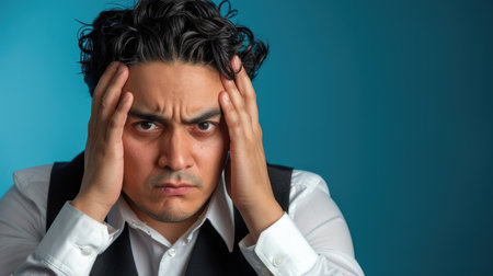 A man stands in a contemporary setting, gripping his head with both hands, clearly overwhelmed by frustration or stress, showing intense emotions.