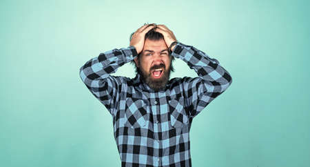 pain in head. modern looking bearded hipster has headache. healthcare concept. brutal handsome man with moustache. mature barber on blue background. masculinity and charisma. oh no