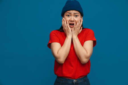 Shocked scared young asian woman in casual clothes standing over blue wall background, covers face with hands