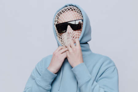 a close studio photograph of a man in a light blue hoodie, a mesh stretched over his face, standing on a light background, with sunglasses covering his eyes, holding the edge of the hoodie