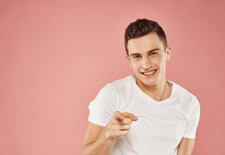 Cheerful man gestures with hand emotions white t-shirt pink background