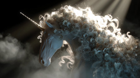 A unicorn with a bright light mane stands in thick mist, creating an enchanting scene full of wonder.