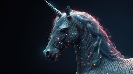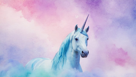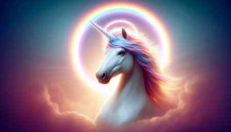 Artistic rendition of a mythical unicorn, complete with a spiraling horn against a vividly colored fantasy background