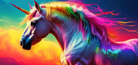 Unicorn horse with rainbow mane and long mane against colorful background