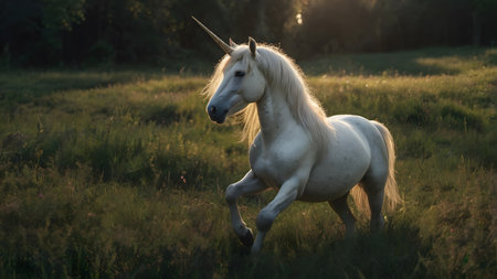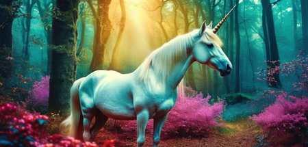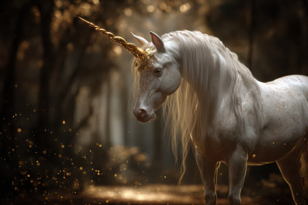 Majestic unicorn with a glowing horn and sparkling mane in a mystical forest. Concept of fantasy, magic creatures, mythical, fairy tale, magic, and ethereal beauty.
