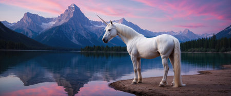 White unicorn is standing on the shore of a lake with mountains and a colorful sunset in the background
