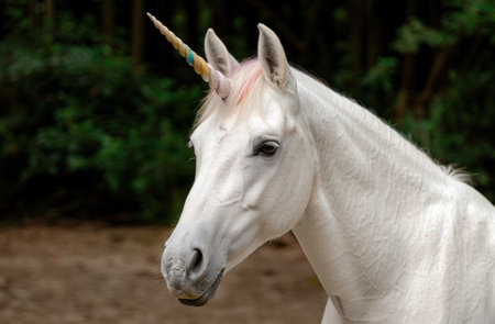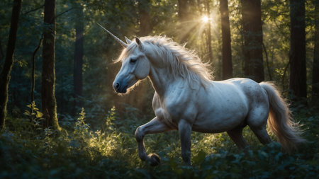 Majestic white unicorn in a magical forest