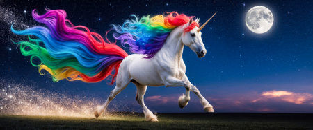 Majestic white unicorn with a flowing rainbow mane and tail running through a field under a starry night sky with a full moon