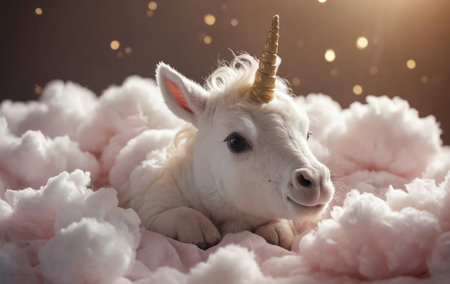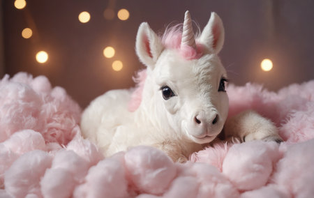 A fawncolored stuffed unicorn with a fluffy fur and a snout is resting on a pile of pink clouds, creating a whimsical and artistic scene reminiscent of a terrestrial animal event
