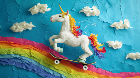 Rainbow unicorn skateboarding. Trendy collage with torn paper.
