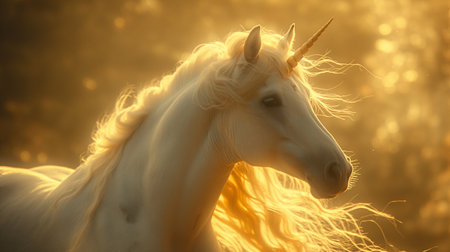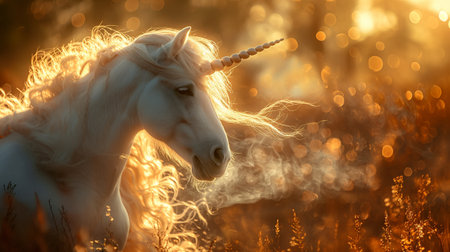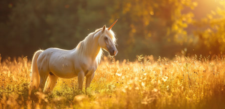 Beautiful unicorn standing in a sunlit golden meadow. Fantasy and mythical creature