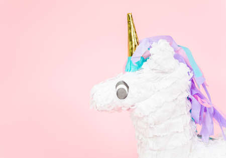 Unicorn with colorful feathers on a pink background. Rainbow unicorn.