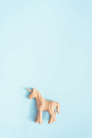 Unicorn figurine on a blue background with free space. Symbol of good luck and success.