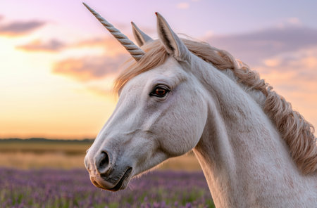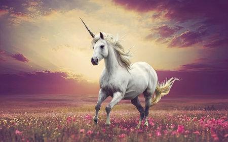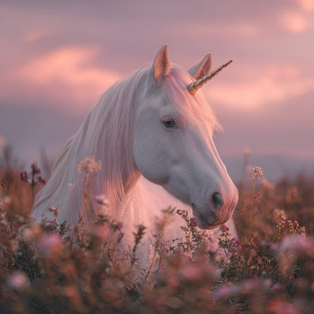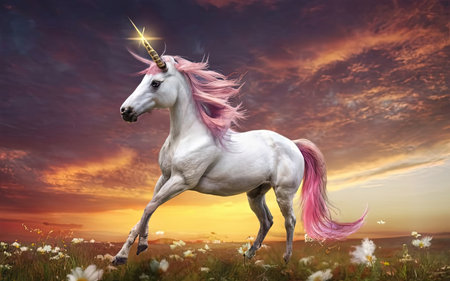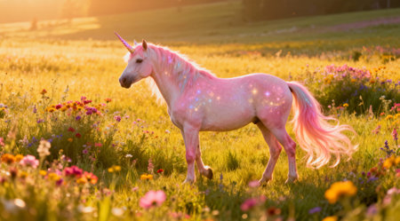 An artistic depiction of a mythical unicorn standing gracefully in a lush meadow filled with an array of colorful wildflowers, ranging from deep purples to bright yellows. The scene is bathed in the warm glow of golden hour, with soft pink and yellow hues enhancing the fantasy atmosphere. This illustration could be used for fantasy-themed book covers, decorative prints, or as part of a whimsical nature series. AI-generated illustration.