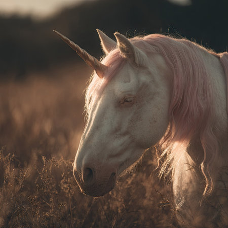 A close-up view depicts a unicorn with a single horn and pink mane in a natural environment. The animal stands in a field illuminated by sunlight, its fur appearing creamy white. The image's soft focus and color palette evoke a sense of fantasy, suitable for various creative projects.