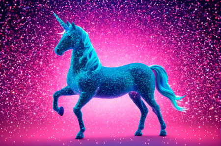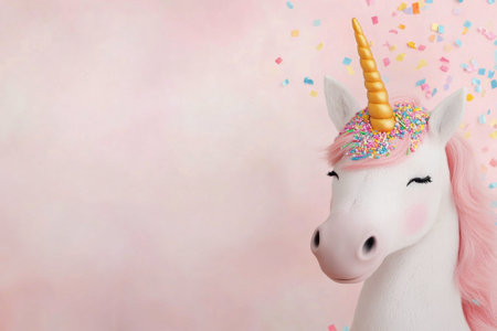 A majestic unicorn with a sparkling horn and flowing pink mane poses against a soft pastel pink background. Colorful confetti falls gently, adding a festive touch to the enchanting scene.
