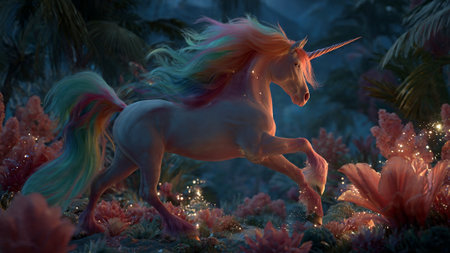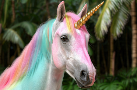 Colorful unicorn in a tropical forest