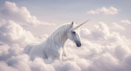 A majestic white unicorn rests peacefully amidst fluffy clouds, its horn gleaming softly. The scene evokes a sense of magic and serenity, blending the mythical with the ethereal sky.