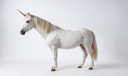 A white unicorn stands against a plain background, its golden horn pointing upwards