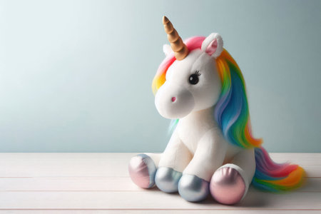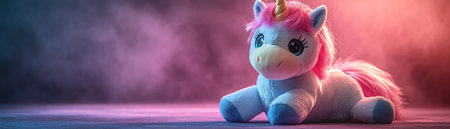 Adorable plush unicorn toy with pastel colors, posed against a purple background