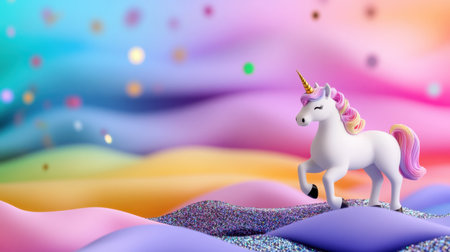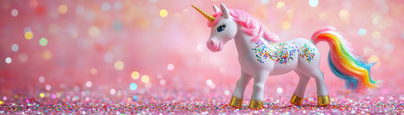 Small toy unicorn with a rainbow mane, surrounded by colorful confetti, sparkling pink background, whimsical