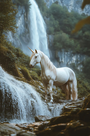 This stunning illustration features a magical unicorn with a shimmering mane and vibrant rainbow horn, standing elegantly in a mystical atmosphere.