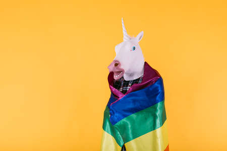 Person dressed in unicorn mask with plaid shirt holding rainbow lgtbq flag, on yellow background. Concept of gay pride, transsexuality, and lgtbq rights.