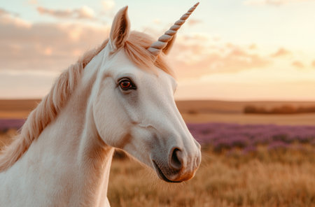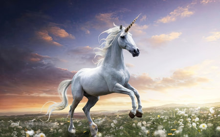 Majestic white unicorn in a field at sunset