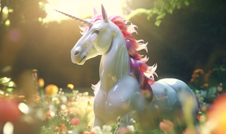 Illustration of a unicorn horse in a beautiful garden, 3d realistic