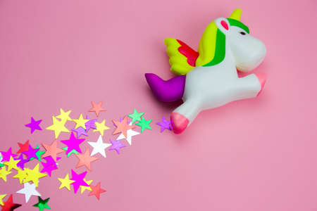 top view squishy toy unicorn and glitters in the shape of stars on pastel pink background