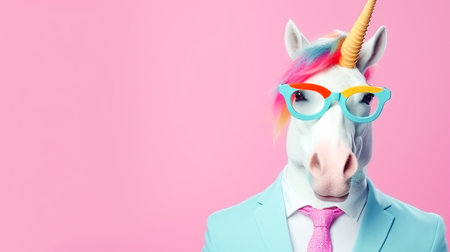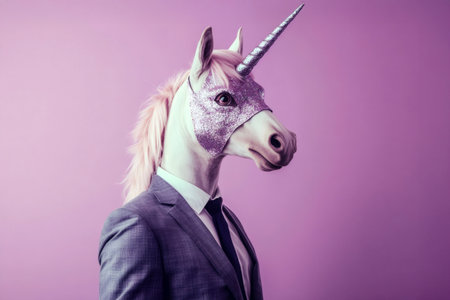 Creative portrait of a businessman wearing an elegant unicorn mask with a shiny horn, embodying fantasy and business in a surreal concept