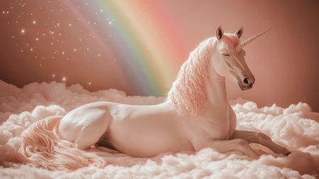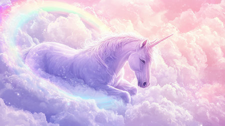 Beautiful White Unicorn Resting on Cloud, Pastel Rainbow Background, Fantasy Magical Scene