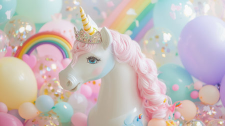 A whimsical unicorn figure stands proudly among a vibrant array of pastel balloons and scattered confetti. The setting conveys a joyful and festive atmosphere, ideal for celebrations.