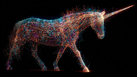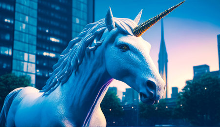 In this striking image, a resplendent unicorn gallops through the heart of a bustling business district, its mane flowing with the momentum of rapid growth. A metaphor for a startup's swift journey to becoming a 'unicorn' - a term for startups valued at over a billion dollars - this scene captures the spirit of entrepreneurial success against the odds. The mythical creature's bold progress among the cabs and skyscrapers embodies the audacity and vitality of emerging ventures in a competitive marketplace. An emblematic piece that illustrates the blend of vision and velocity on the road to commercial triumph.