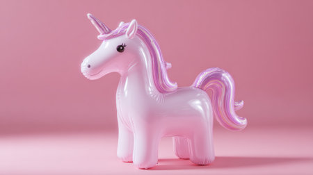 Inflatable unicorn in center of frame, soft pastel pink background, minimalist summer aesthetic ideal for modern lifestyle stock imagery