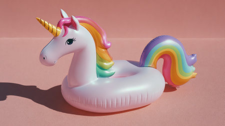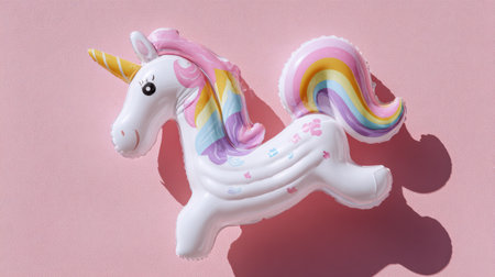 Single unicorn pool toy in vibrant colors against a pastel pink surface, fun and trendy summer minimalism with a playful and lighthearted vibe