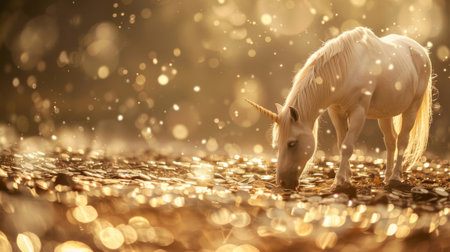 A unicorn grazing in a field of virtual coins embodying the idea of digital currency
