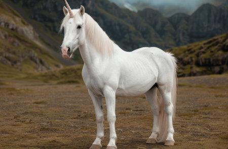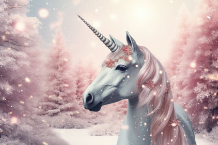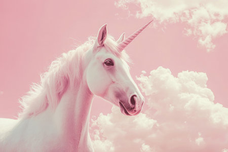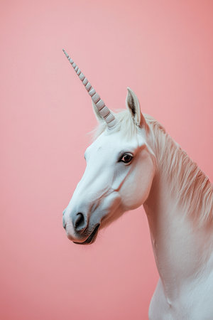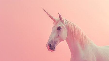 A mythical white unicorn stands gracefully against a soft pink backdrop, creating a surreal and enchanting scene.