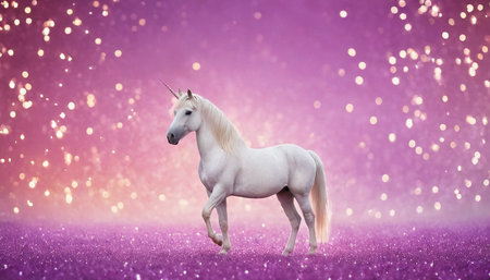White unicorn on purple background with bokeh lights. 3d rendering