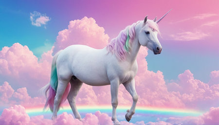 A mythical unicorn against a backdrop of fluffy clouds and a radiant rainbow