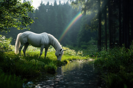 A white unicorn is grazing in a lush green field next to a river. The scene is serene and peaceful, with the rainbow in the sky adding a touch of magic to the image