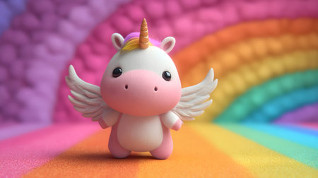 Adorable 3D Little Unicorn with Wings and Rainbow in Fantasy Landscape