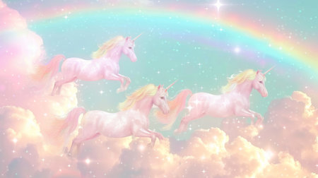 A stunning unicorn leaps joyfully through soft pastel clouds, illuminated by sunlight and a colorful rainbow, creating a dreamy, whimsical atmosphere.