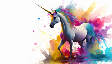 Fabulous theme showing a walking unicorn in multicolored vibrant splashy ambiance. AI generated image with lots of paint splashes, splatter and spots