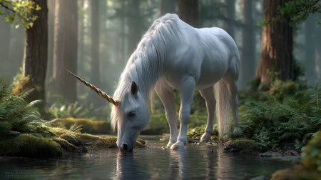 White unicorn drinking water in forest stream with sunlight filtering through tall trees, creating magical and serene atmosphere in lush green woodland